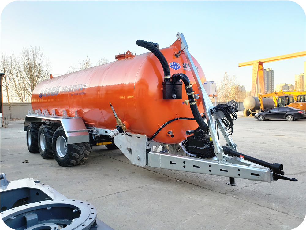 2FYP系列液态撒肥机(液体有机肥施肥罐车),以拖拉机后输出轴为动力,驱动真空泵进行工作,控制完成吸肥和喷肥工作。主泵、控制阀、承重车轴等部件采用进口产品,性能稳定可靠。该液态抛肥车罐体材质采用了压力容器专用高强度钢,罐体內外均喷有防腐、耐酸碱性能优越的涂层(可选配罐体热镀锌防腐蚀处理工艺),罐体内部集成有坚固的防浪涌挡板,保证罐体有足够的抗拉强度、冲击韧性与耐腐蚀性。罐体前部安装有液位显示仪,方便操作者实时观察罐体内液体容量变化。该液态撒粪车设计配备多级过载保护装置,对主泵、罐体、管道等进行压力保护。