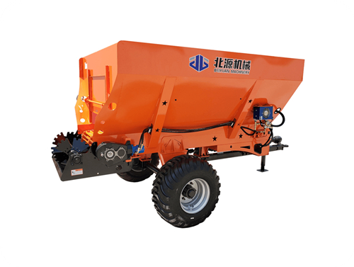 2FGH-H系列横绞龙撒肥车,用于抛撒各种干湿粪肥,特别是含水量大的黏湿粪肥和大块粪肥。可使抛撒肥料被充分破碎、均匀抛撒,具有较好的粉碎及撒布效果。该撒粪机利用拖拉机动力输出作为驱动,带动车厢内部的输送链自动把肥料向后输送,肥料输送快慢可调节,通过高速旋转的横螺旋绞龙装置将肥料打碎并均匀抛撒出去,施肥量可调节。该撒粪车适用于大型农场、牧场、草地等地的粪肥、有机肥抛撒作业,可实现大规模统一、高效施肥作业,降低劳动强度,提高施肥效率,节省成本,实现各种经济效益