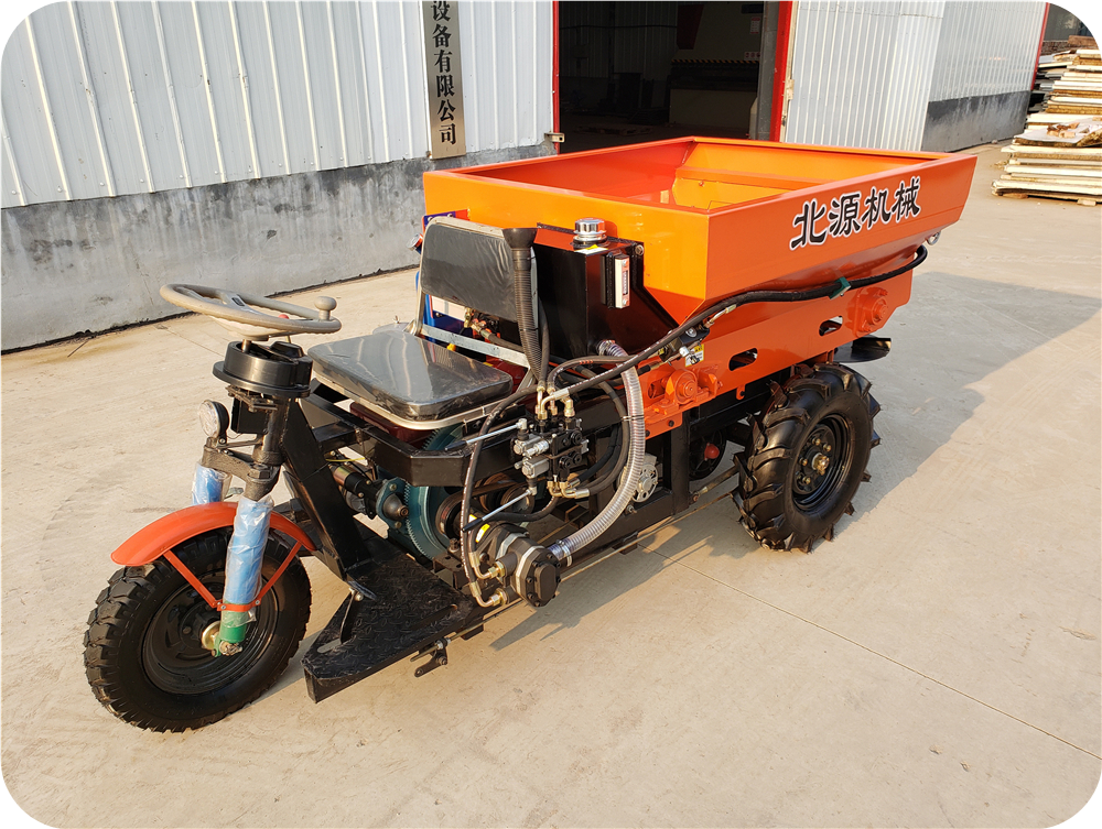 2FZGB-SL系列三轮车自走式洒粪机,采用农用三轮车底盘架构,设计配备肥料输送装置和肥料抛撒装置。肥料抛撒装置有卧式螺旋撒布和立式双圆盘撒布可选。自带柴油机动力,无需拖拉机带动,一体机设计,结构紧凑,转向灵活,尤其适用于大棚、丘陵、小块田地作业。该大棚洒粪机适合抛撒各类厩肥、粪肥、有机肥、石灰、酒糟、糖渣、颗粒肥等不同形态的物料。操作简单,适用性广,可达到提高施肥效率、降低劳动强度、改善土壤结构等目的。