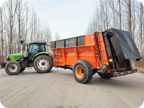 2FGH-S系列双竖绞龙扬粪机,用于抛撒各种干湿粪肥,特别是含水量大的黏湿粪肥和大块粪肥。可使抛撒肥料被充分破碎、均匀抛撒,具有较好的粉碎及撒布效果。该双轴绞龙式扬粪机由拖拉机牵引带动,撒肥车肥料输送系统直接采用拖拉机液压输出动力驱动,带动车厢内部的输送链自动把肥料向后输送,肥料输送快慢可调节;肥料抛撒系统由拖拉机后动力输出轴驱动,通过高速旋转的双竖螺旋绞龙装置将肥料打碎并均匀抛撒出去,施肥量可调节。该绞龙式扬粪机适用于大型农场、牧场、草地等地的粪肥、有机肥抛撒作业,可实现大规模统一、高效施肥作业,降低劳动强度,提高施肥效率,节省成本,实现各种经济效益。