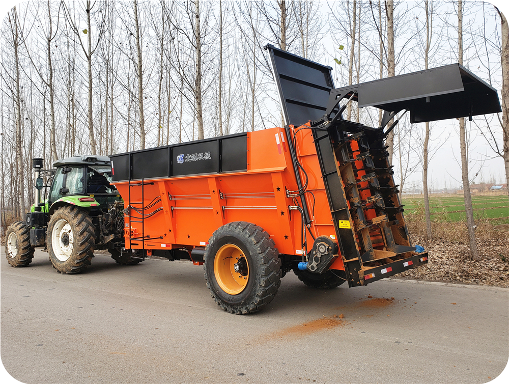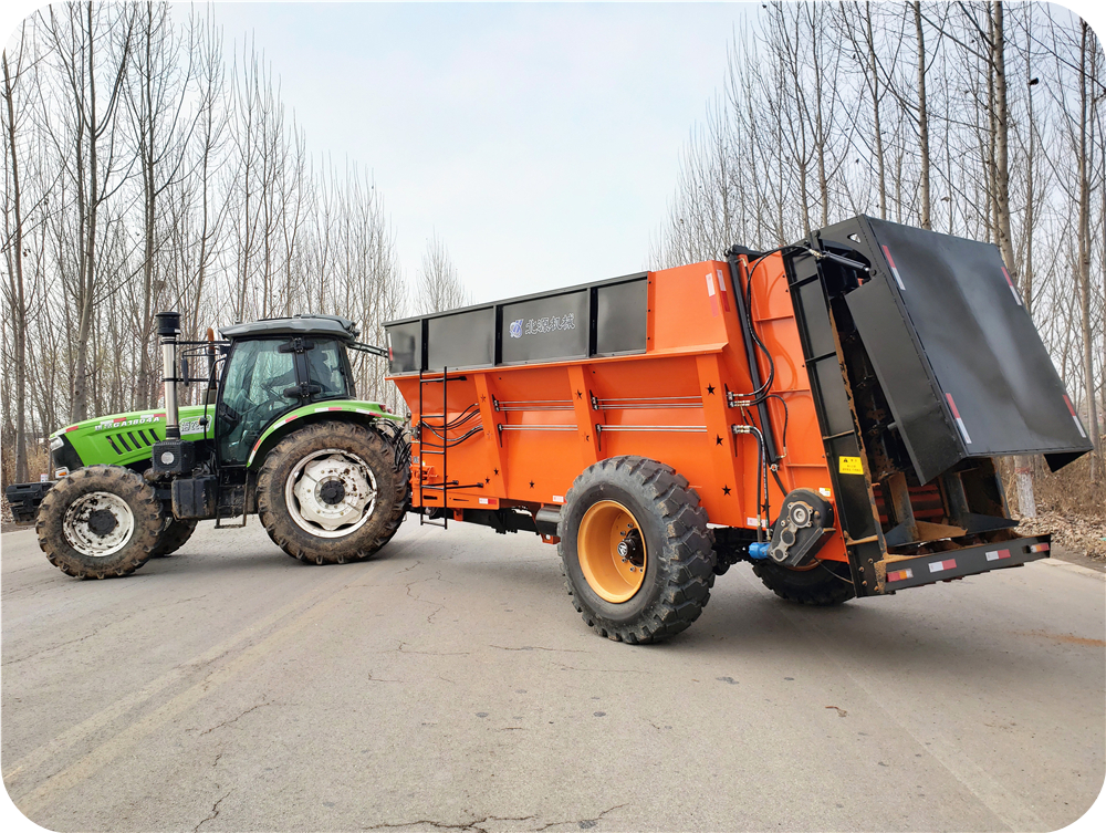 2FGH-S系列双竖绞龙撒粪车,用于抛撒各种干湿粪肥,特别是含水量大的黏湿粪肥和大块粪肥。可使抛撒肥料被充分破碎、均匀抛撒,具有较好的粉碎及撒布效果。该[由拖拉机牵引带动,撒肥车肥料输送系统直接采用拖拉机液压输出动力驱动,带动车厢内部的输送链自动把肥料向后输送,肥料输送快慢可调节;肥料抛撒系统由拖拉机后动力输出轴驱动,通过高速旋转的双竖螺旋绞龙装置将肥料打碎并均匀抛撒出去,施肥量可调节。该撒粪车适用于大型农场、牧场、草地等地的粪肥、有机肥抛撒作业,可实现大规模统一、高效施肥作业,降低劳动强度,提高施肥效率,节省成本,实现各种经济效益。