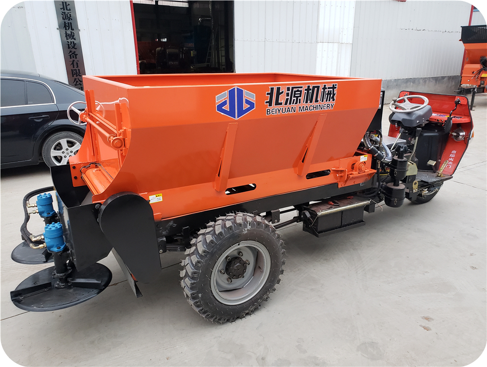 2FZGB-SL系列三轮车自走式扬粪机,采用农用三轮车底盘架构,设计配备肥料输送装置和肥料抛撒装置。肥料抛撒装置有卧式螺旋撒布和立式双圆盘撒布可选。该蔬菜大棚用扬粪机自带柴油机动力,无需拖拉机带动,一体机设计,结构紧凑,转向灵活,尤其适用于大棚、丘陵、小块田地作业。该大棚扬粪机适合抛撒各类厩肥、粪肥、有机肥、石灰、酒糟、糖渣、颗粒肥等不同形态的物料。操作简单,适用性广,可达到提高施肥效率、降低劳动强度、改善土壤结构等目的。